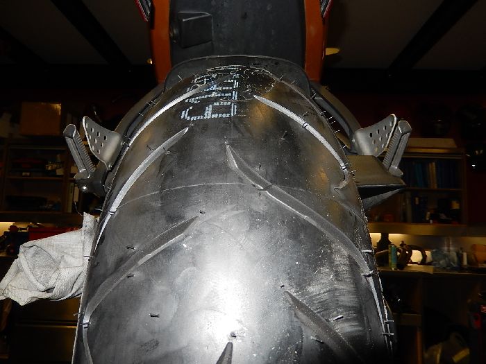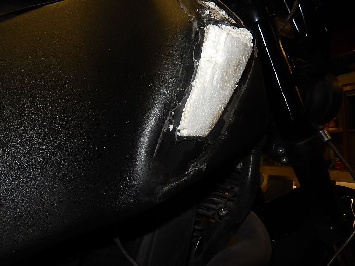 Buell Xb12SX 2010, Crash repair, ugly frame dent, the frame puck worked, but replacing the frame would mean a total write off, customer want to keep his Buell, so he is settling with the dent.