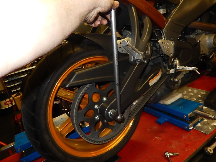 Buell XB12SS, rear tire change , tight axle , needs the breaker bar to loosen it.