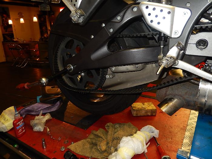 Buell XB12SS 2008, putting back the engine, idler pulley back on, and tighten the rear axle.