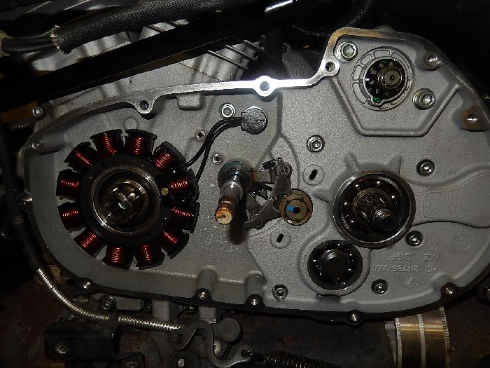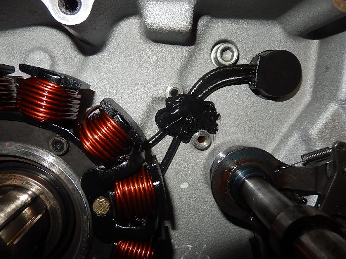 Buell XB12SS 2008, putting back the engine, something i like to do... little silicone on the stator wires to prevent theme from rubbing.
