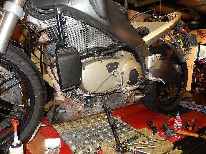 Buell XB12SS 2008, putting back the engine, route the gear box breather hose before you put the engine in, makes live more easy.
