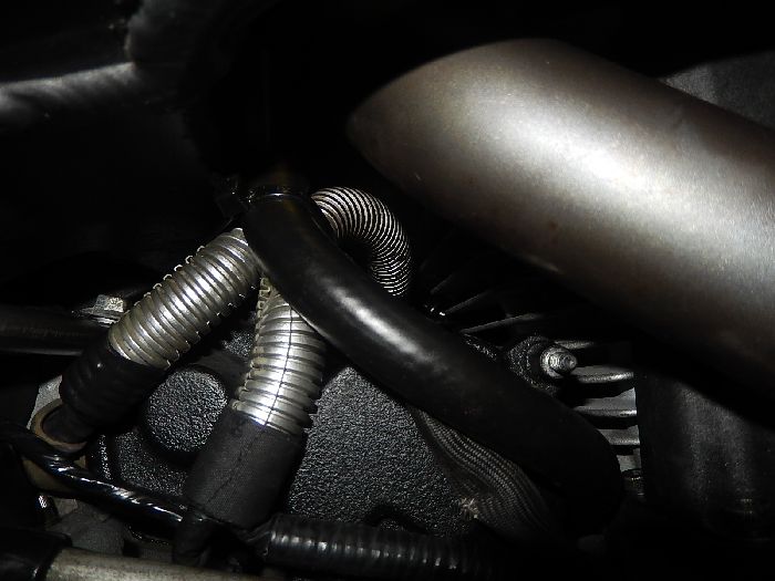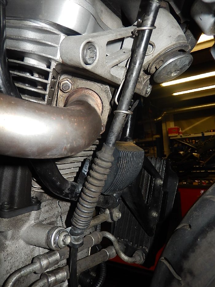 Buell XB12SS 2008, putting back the engine, pull op the gearbox breather hose so you have enough lenght to mount it on the shock, check behind the rear header for clearance to the header, and fixate the wires and hose with a ty-rap.